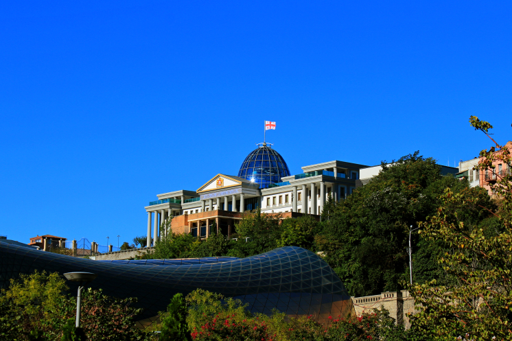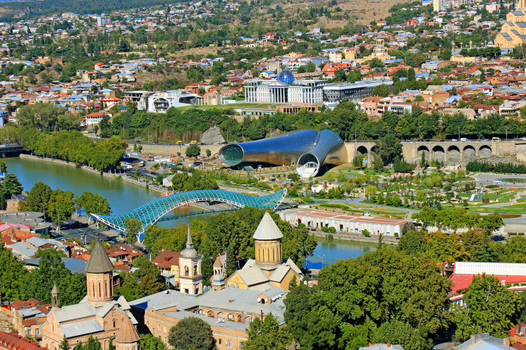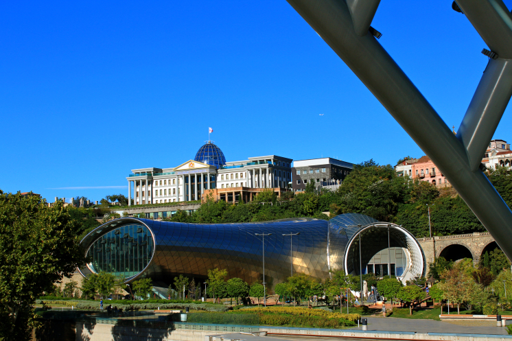 Побродив по старому городу и району серных бань, мы вышли к набережной реки Куры. Через реку протянуто множество мостов, но самым запоминающимся и современным является мост мира, соединяющий старый город с парком у Авлабарской резиденции президента.