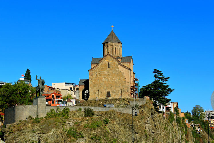 Прогулявшись по парку, мы вернулись к мосту мира и старому городу. Перекусили хачапури сыром и кубдари с мясом. По пути посетили церкви Святого Георгия и Метехи на краю обрывистого берега Куры.