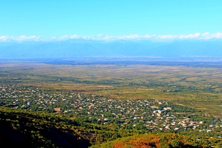 Окруженная с двух сторон горными цепями в форме раскрытой пасти кроводила, долина носит название проистекающей по ней реки Алазани. Вся территория обсажена виноградниками и фруктовыми деревьями.