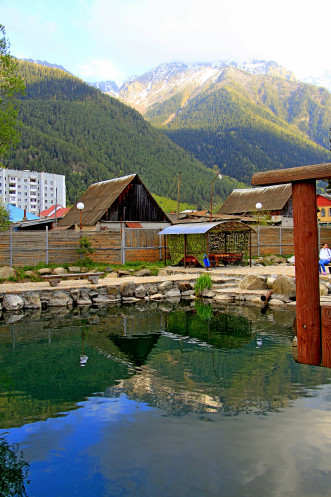 После посещенного водопада мы решили доехать до форелевого хозяйства в поселке Теберда, посетить которое настоятельно нам рекомендовала хозяйка. Рядом с полицейским участком поселка имеется множество указателей на зону отдыха «Озерный».