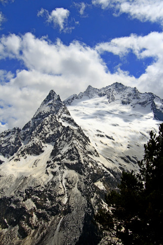 Облака постепенно рассеивались и над горой Белалакая (3 861 м.), название которой переводится с черкесского как «скала с пестрыми полосами». Эти полосы образуют слои белого кварца, а благодаря своей ровной треугольной форме ее еще называют "Кавказский Маттерхорн".