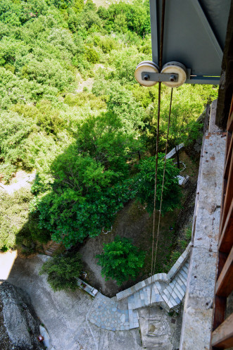 Подъемное устройство впечатляет,ведь раньше не было этой канатной дороги и монахи поднимались на скалу и спускались вниз в сетке,прицепленной к этому крюку.Это страшно,наверное,ведь веревка может порваться...А если ветер,тогда может так стукнуть об скалу,что до места доберется только набор костей...