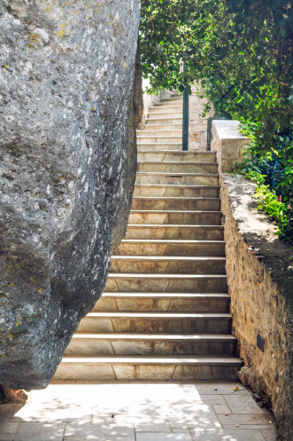 Чтобы попасть монастырь Святой Троицы,нужно сначала спуститься к подножию скалы,а потом подняться по крутой лестнице наверх.