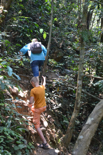 Сначала поднимаемся высоко вверх, цепляясь то за веревку, то за деревья, переступая через высокие и мокрые камни….