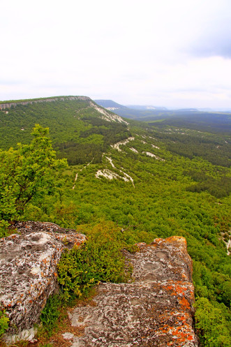 Прогулявшись по вершине горы Тепе-Кермен и осмотрев ее по всему периметру, мы спустились вниз по другому склону через густой лес. Весь путь туда-обратно вместе с осмотром занял у нас чуть больше 3х часов. При спуске начал накрапывать дождь, а в стороне Симферополя темные хмурые тучи нещадно поливали город. Просветы виднелись только в стороне Бахчисарая, куда мы и направились после осмотра Тепе-Кермен.