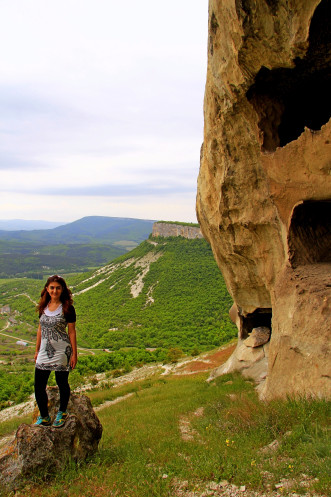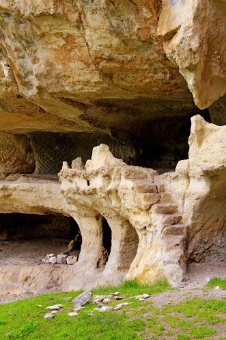 Тепе-Кермен считается самым малоизученным пещерным городом, поскольку здесь проводились только эпизодические раскопки. Но это не мешало нам фантазировать и строить собственные выводы и предположения. Небольшие выемки видимо прикрывали шкурами животных, а внутри разжигали костры, судя по копоти, отложившейся на стенах помещений. Кое-где встречались хорошо сохранившиеся лестницы и выемки в форме арочных полок, на которых похоже хранилась домашняя утварь и иконы.