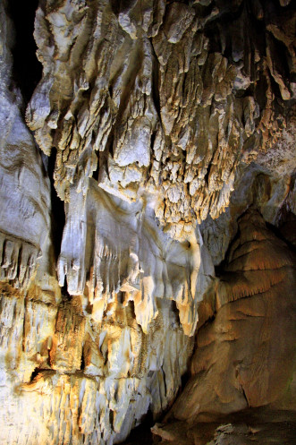 Мы купили билеты и стали согреваться чаем в местном буфете. Через полчаса собралась группа на экскурсию по всем открытым залам пещеры Мраморной. Первым был зал под названием «Сказка», где сталактиты и сталагмиты по форме напоминали многих сказочных персонажей. Главное, чтобы хватило фантазии на то, чтобы увидеть всех. Молочные разводы потолка и шоколадные стен добавляли в фантазии красок.