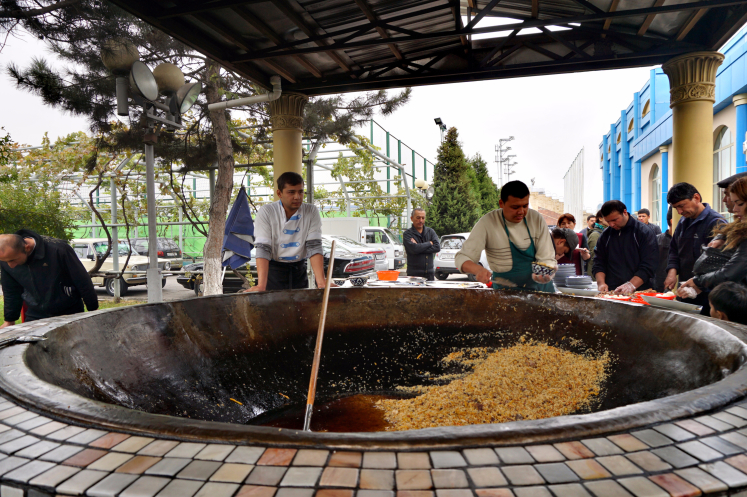 Центр поражает даже не своими масштабами, а объемами приготовляемого плова. Плов начинают готовить с утра во дворе в пяти громадных чугунных казанах-котлах, вмещающих по 50 кг риса.