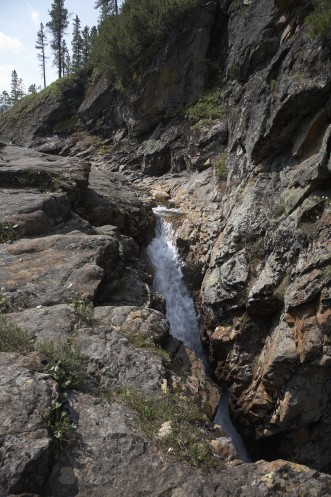 Уже на нашем Посетительском есть целый каскад водопадов. Первый, самый большой, смотрим сначала сверху, но, как и любой водопад, в таком ракурсе он не очень интересный, поэтому аккуратно по крутой тропке спускаемся вниз по реке к основанию водопада.