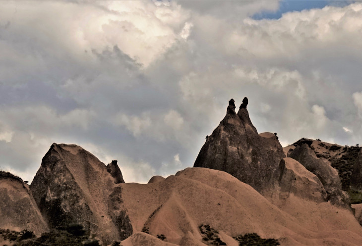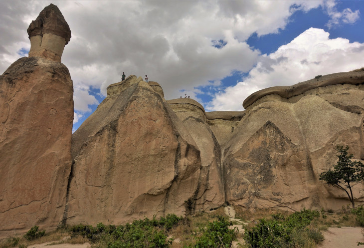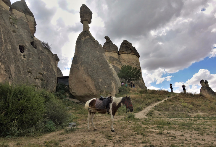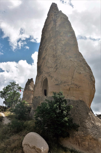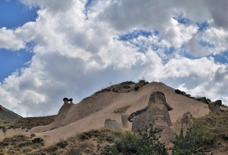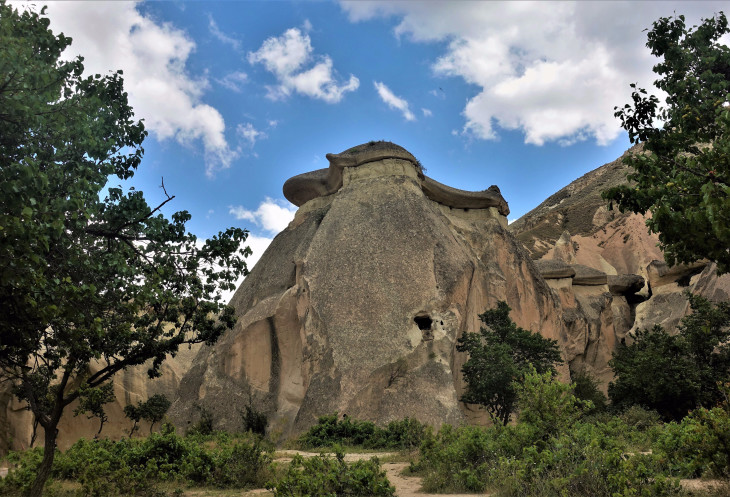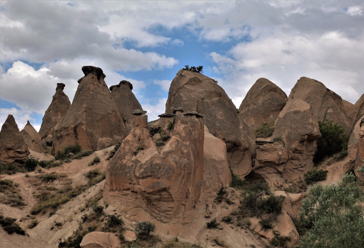 Останавливались в Пашабаг (по правилам турецкого языка, произносится «ПашабА»), или Долине монахов – одной из красивейших долин Каппадокии. Здесь природа постаралась, разбросала двух и трёхглавые «грибы»- они образовались из мягкого туфа, а шапочки на них- из более твёрдого базальта. Еще в древности, где-то в 10-11 веке, а то и раньше, здесь селились монахи. Жили уединенно, выкапывая в мягкой породе "грибов" себе кельи. Теперь на месте келий- окошечки в скалах- грибах, как в причудливых замках. Как говорят легенды, монахи ночами зажигали свечи и в долине светились огоньки, похожие на сказочные камины. Их сейчас незывают "камины фей". Когда бродили по этой долине, нас не оставляло ощущение какой-то нереальности, инопланетности окружаюшего...
