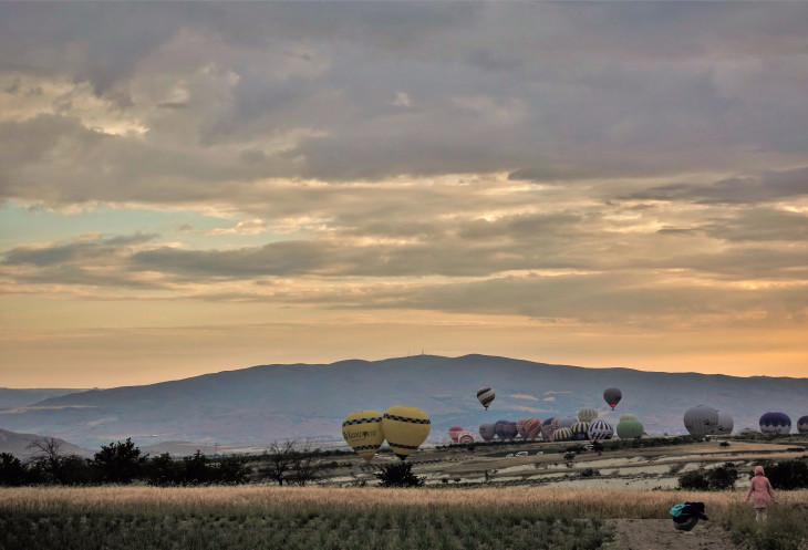 В общем, мы имели счастье сначала понаблюдать с земли за фантастическим зрелищем полёта разноцветных шаров на фоне разгорающегося рассвета,