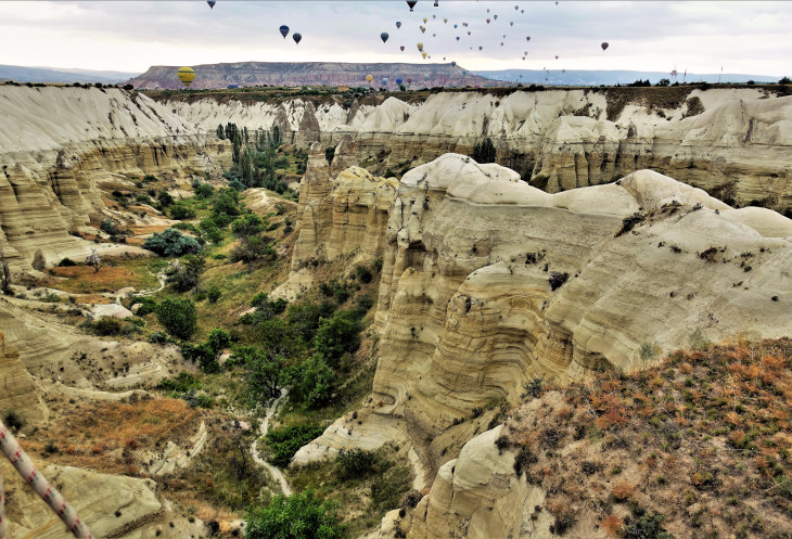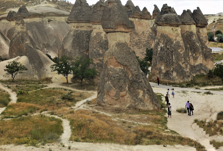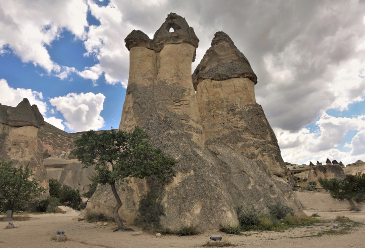 Вот тут мы и насмотрелись от души необычайно красивых и ставших уже, наверное, визитной карточкой Каппадокии знаменитых каменных столбов, или каменных грибов. Образовалось всё это чудо в результате миллионолетней работы природы: активной деятельности вулканов с выбрасыванием пепла и лавы, которые откладывались слоями, превращались в туф и базальт. А ветер, дожди, перепады температуры приводили к эрозии. В результате на свет божий появилась эта нереальная сюрреалистическая местность под названием Каппадокия: все эти волшебные трубы фей (по-турецки называется , peribacalar / перибаджалар, или по-английски fairy chimneys) немыслимые каньоны, долины, нереальные фигуры. К сожалению, то, что когда-то создало эту фантастическую местность, оно же ее и погубит. Эрозия продолжается, а значит, когда-нибудь вся эта красота исчезнет.
