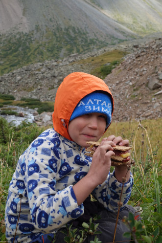 Идти оказалось не так просто. Ага, оказалось, так неожиданно, сколько раз хожу по этой дороге — столько раз «неожиданно» оказывается. Высота начинает чувствоваться уже к обеду. И у нас головы пухнут, и дети ныть начали. Но, надо сказать, это был самый «нытельный» день за весь поход — дальше все было нормально. Так что плохое настроение спишем на горняжку и акклиматизация.