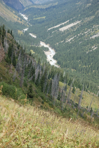 Здесь тропа очень быстро встречает старую грунтовую дорогу — когда-то по ней ходили на Иссык-Куль, но сейчас туда нельзя, потому что граница с Киргизией. И вообще не очень понятно, куда можно, а где погранзона.