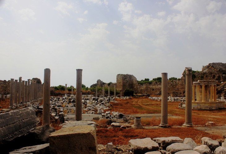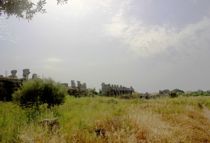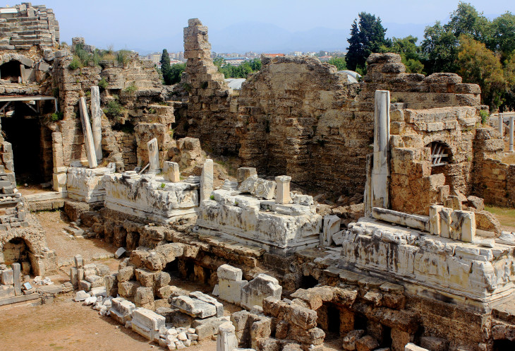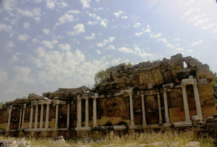 К сожалению, со стен амфитеатра моря не видно - гавани и знаменитый (в узких кругах побывавших в Сиде) храм Аполлона - это другая часть древнего города... А вот некоторые сооружения типа фонтана Веспасиана и знаменитого общественного бесплатного туалета (латрины) (Античный общественный туалет Агоры) на глаза попадаются и даже цепляют взгляд, - больше здесь особо нечему цеплять - в основном одни совсем уж развалины и рассказы о том, что тут было раньше.