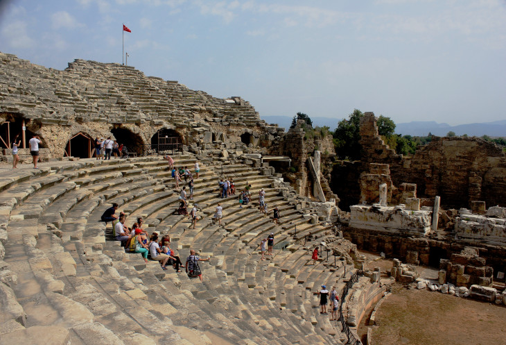 Сначала была остановка в этом самом Сиде - у ворот древнего города, - одно из самых впечатляющих мест, что я там видела. Потом по длинной-длинной главной (одной из трёх главных) улиц мы отправились к амфитеатру. Впечатляет, конечно. Особенно понимание, что нет никакого холма, на который отпирались бы трибуны, - совсем другая строительная технология. Ну и ещё врут, что там могли проводить преловутые сражения кораблей, - но гид честно сама посомневалась. А кто врёт про римский колизей подобное, - не стесняется говорить без сомнений, некоторые не стесняются. Но это отвлечение.