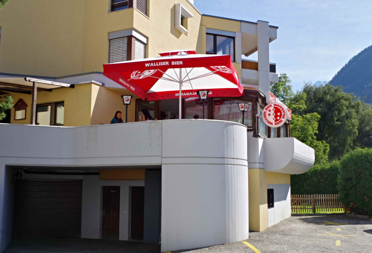 В план моей поездки входила гастрономическая часть. Мне очень хотелось попробовать местную, альпийскую кухню и получить гастрономическое впечатление, вдобавок к культурному. Но план так и оказался не реализованным. Я была несколько уставшей, гуляя по Бригу (надо принять во внимание, что Бриг расположился не на равнине). Поэтому, когда время приблизилось к обеду, я уже была далеко от центра города, где расположились самые лучшие рестораны. Да и мой туристический вид с стоптанными кроссовками был бы в диссонансе с интерьерами дорогих ресторанов. Поэтому когда на моем пути возник простенький ресторан с террасой, я не колеблясь вошла в него.