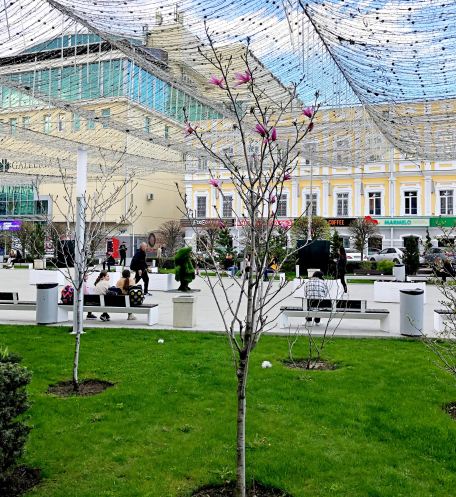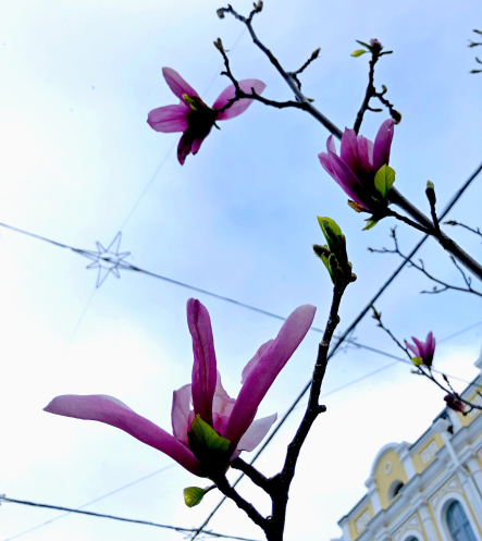 Но надо было пройти на соседнюю – Александровскую – площадь (в простонародье – площадь Ангела, который там был установлен к 225-летию города и с тех пор так и норовит «дерябнуть по кумполу» нерадивого жителя или гостя… грозный, в общем, но визуально об ангеле чуть дальше). На Александровской площади я мечтала воочию понаблюдать за цветением сакуры – высадили в прошлом году, как раз в самые пандемические ужасы, так что видел мало кто, но слухи и кем-то снятые кадры бередили воображение. Однако с сакурой тоже вышел облом-с – уже отцвела… Зато, снова внезапно, площадь оказалась почти вся засажена цветущими магнолиями – ну чисто Никитский ботанический сад! Правда, в НБС деревья уже выросли большими, а тут скорее кустики… Но вид… И, главное, возможность близко рассмотреть цветочки, без надобности лезть на дерево… Жаль, звёздчатая магнолия уже почти отцвела, её лепестков больше валялось на земле, чем на деревце, в остальном же – впечатления зашкаливали: наконец-то ради цветения магнолии не надо тащиться в чужие края!