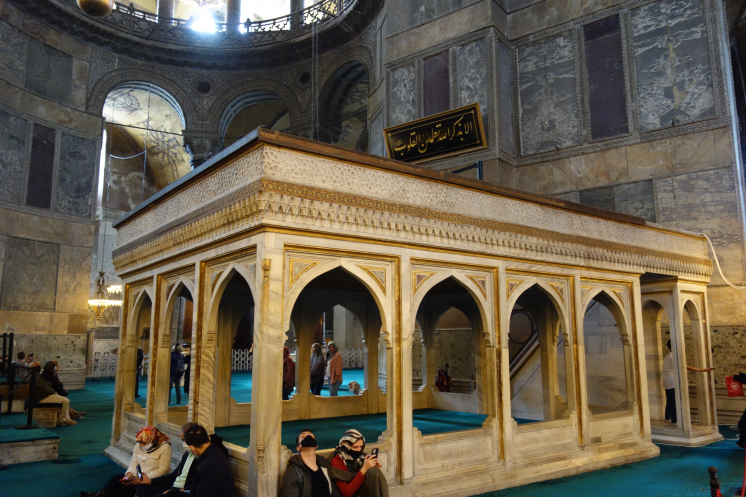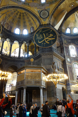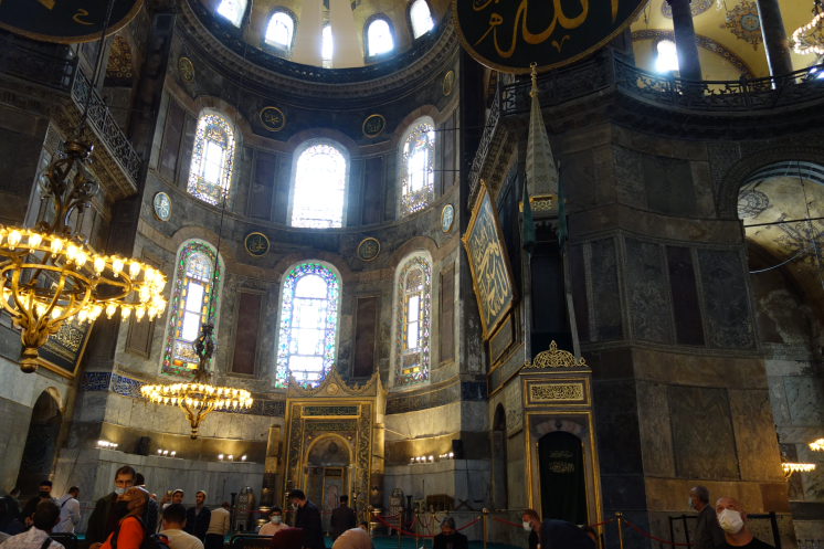 На следующий день у нас была большая экскурсия: Ипподром, Голубая мечеть, Айя София, Топкапы, обед и прогулка по Босфору. Я везде была, но взяла эту экскурсию за компанию, тем более, в Голубой мечети во время моего посещения был ремонт (который так и не закончился, по-прежнему почти ничего не видно). Ну и хотелось посмотреть, что осталось от Айя Софии после переделки ее из музея в мечеть. Как выяснилось, почти ничего: на второй этаж не пускают, к знаменитой колонне не пускают, в помещение, где крестилась княгиня Ольга, не пускают, пол закрыли коврами, оставив открытым только место, на котором короновали императоров (огородив его лентой). Забавно, но сидевшие на ковре рядом молодые мусульманки зачем-то гладили этот древний пол, видимо, не имея ни малейшего понятия об истории места. Зато порадовала какая-то старушка, перекрестившаяся в этой новоявленной мечети. Провозглашалось, что после перевода собора из статуса музея в мечеть (хотя это их великий Ататюрк велел сделать из мечети музей) Айя София станет более доступной для туристов. Ха-ха три раза: да, вход бесплатный и очереди небольшие (может, из-за ковида), но увидеть-то можно меньше половины. И маленькая деталь: туалет в мечети сделали платным, хотя в музейные времена он был бесплатным!