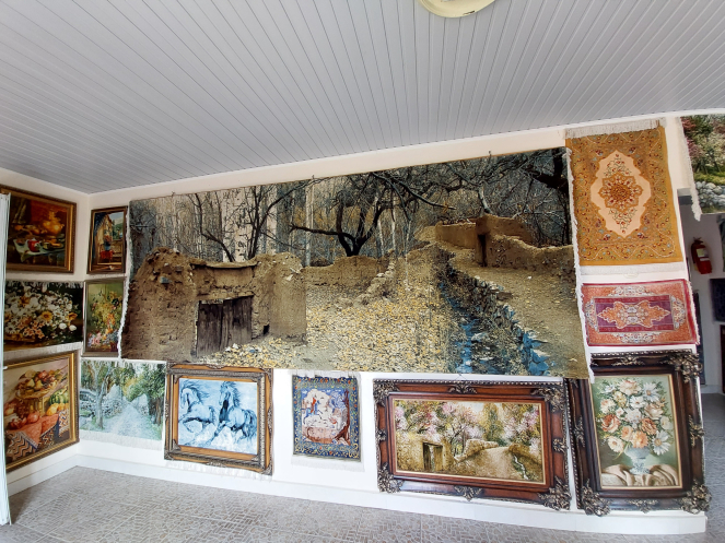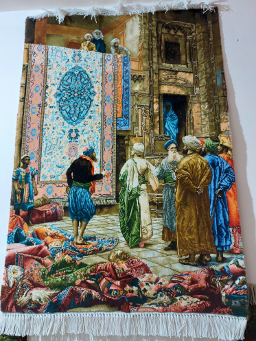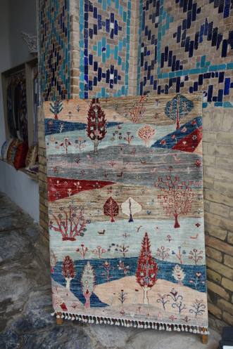 Следующий день мы начали с поездки на ковровую фабрику «Худжум», где вручную ткут шелковые ковры. Фабрику основал эмигрант из Афганистана: у них всегда было неспокойно. По большому счету, это не ковры, а произведения искусства. Особенно мне запал в душу ковер с парой, идущей под зонтиком. И стоит «недорого» – 3 000 долларов. Некоторые ковры больше напоминали фотообои, бывшие популярными лет 30 назад. По причине субботнего дня над коврами работало только несколько мастериц. Кропотливый труд. Напарник спросил про цены, указанные на обратной стороне ковров: за погонный метр или за штуку. Хозяин пояснил, что цена зависит не только от размера, но и от сложности узора, плотности набивки рисунка, качества нитей… Для примера кинул на пол три ковра, назвал цену одного и предложил угадать цену остальных. Сначала неправильный ответ дала я, а потом напарник и мужчина, который осматривал фабрику вместе с нами. Я руководствовалась тем, что два других ковра были более «мягкими и шелковистыми», нити лежали плотнее, а рисунки были примерно одинаковой затейливости. Оказалось, что два других ковра машинной работы и стоят на порядок дешевле. Что по мне, «зачем платить больше, если не видно разницы», но есть, видно, люди, эту разницу чувствующие. Так что облапошить нас на ковровом базаре было бы нетрудно.