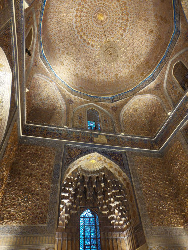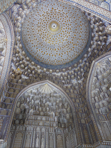 Начали знакомство с Самаркандом мы с Гур-Эмира, усыпальницы Тамерлана. Сейчас она отреставрирована, вся раззолоченная. Гид рассказала, что, когда она в первый раз туда попала во время учебы, это было жалкое зрелище: обвалившиеся плитки, заплесневелые стены. Некоторое количество исторических плиток сохранилось, их нам показали. Но большая часть – реконструкция. В зале стоят надгробия Тимура, его наставника Мир Сайид Барака, его внуков Улугбека и Мухаммад-Султана и некоторых других родственников. Но сами останки находятся в крипте, вход туда закрыт: все помнят легенду, что в день, когда археологи вскрыли гроб Тимура, началась Великая Отечественная война. От Регистана я после площади Нагше Джахан в Исфахане ждала большего, но тоже красиво. Правда, вид портила установленная посреди площади сцена, где на следующий день должен был состояться концерт. Большая часть комнат бывших медресе используется как магазинчики сувениров (как хорошо, что наши карты не принимают – я бы весь Узбекистан скупила!), но есть и музейные помещения, например, посвященные Улугбеку-астроному. В одном магазинчике стоял манекен с настоящей паранджой, я не удержалась и глянула через сетку из конского волоса, видно ли что-нибудь: снаружи она кажется совершенно непрозрачной. Оказывается, видно неплохо. Но все равно ходить в этом накинутом на голову халате с сеткой на лице наверняка неудобно. Если при путешествии по знойной пустыне с песчаными бурями это была оправданная мера, то в мирной жизни совершенно лишняя. Кстати, в Узбекистане нам объяснили смысл чалмы: оказывается, длинную полосу ткани наматывали на тюбетейку, потому что в долгом путешествии по Великому шелковому пути всякое может случиться, а если что – саван под рукой. Я-то думала – чтобы лицо закрывать во время пыльной бури.