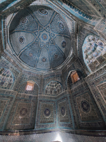 Дальше был комплекс Шахи-Зинда, где похоронено много сподвижников Тимура и их родственников. Впрочем, при раскопках там обнаружили и более старые гробницы, XII века. Комплекс расположен на горке, мавзолеи стоят плотно – снимки особо не сделаешь. Но красиво очень, тут конечно большая заслуга реставраторов. Кое-где и оригинальная плитка сохранилась. Несмотря на тесноту, в узком проходе всё позировала для фотографий девица, нацепившая местный пестрый халат. Ей явно было все равно, на фоне чего фотографироваться, но остальным она мешала очень. Сильно не люблю подобных фифочек: спроси ее, как называется место и кто похоронен – не ответит. Да я не уверена, что она и про Тимура слышала.