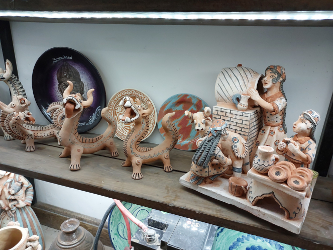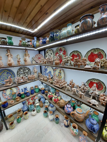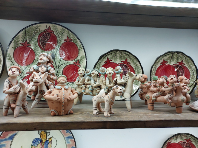 После масляной мастерской мы пошли в гончарную. Предлагалось самим попробовать слепить горшочек, но мы отказались: это только кажется, что горшочек сам собой возникает под руками. В отличие от других виденных мною процессов изготовления керамических изделий, здесь его формировали в верхней части кучки глины и срезали с кучки, а не непосредственно с гончарного круга. В Гиждуване, через который мы поехали в Бухару на следующий день, кстати, поступали так же. В магазинчике при гончарной мастерской много симпатичных поделок, разных скульптурок. Например, удлиненная фигурка верблюда с кучей седоков у них называется «лимузин». Недешевые поделки, но качественные и все разные. Напарник купил какого-то бабая (старика) на память.