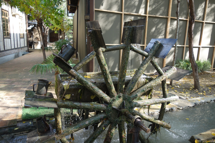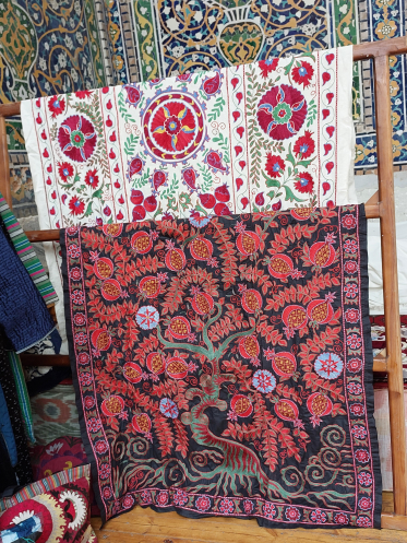 Посетить ремесленный поселок Кунигил в 7 км от Самарканда мы по плану должны были в предыдущий день, но гид изменила программу, руководствуясь прогнозом погоды: накануне шел дождь, а в этот день была прекрасная солнечная погода. Действительно, кое-где приходилось обходить последствия вчерашнего дождя. В поселке делают бумагу из коры шелковицы по восстановленной старинной технологии: кору обдирают с веток, варят, измельчают с помощью толкушки с «речным» приводом, процеживают взвесь на сетках, наклеивают получившиеся листы на гладкую поверхность, как когда-то глянцевали свежепроявленные фотографии. Подсохшие листы потом полируют камнями или ракушками, нам предложили попробовать. Я рассказала гиду, что в подобном центре ремесел Дудутки в Беларуси мужчине подарили выкованную им подкову, но она ответила, что отполированную нами бумагу нам не отдадут. В свое время такая бумага очень ценилась за прочность. Для примера в магазинчике висит несколько платьев, сшитых из этой бумаги. Платья немного порвались, но гид сказала, что их несколько раз стирали. Напарник приценился к обложке для паспорта из шелковичной бумаги, но воздержался от покупки. Еще там продавали кукол ручной работы в бумажных платьях, рисунки на этой бумаге и т.п. Дальше нас повели в мастерскую по отжиму масла из семян хлопка, дыни и пары злаков. Это масло в Самарканде и окрестностях используют в приготовлении плова, дынные семечки добавляют для аромата.