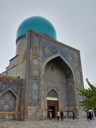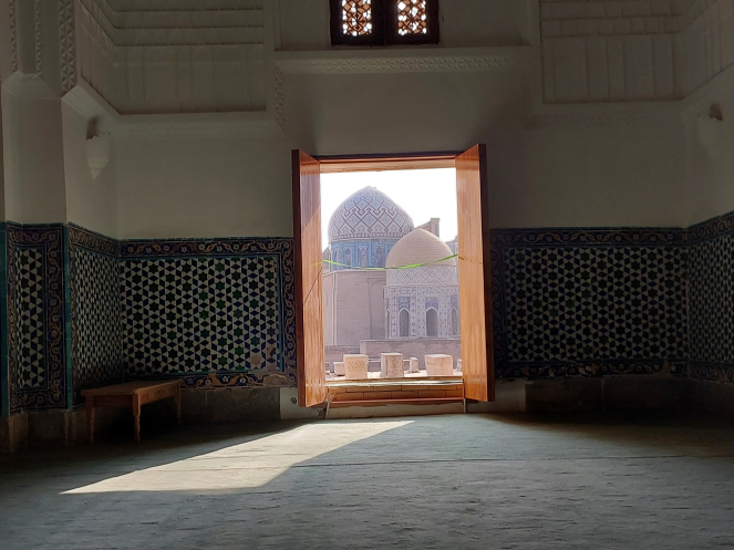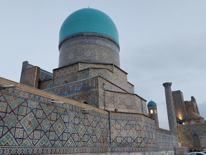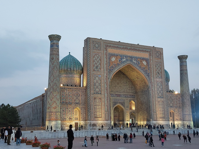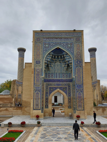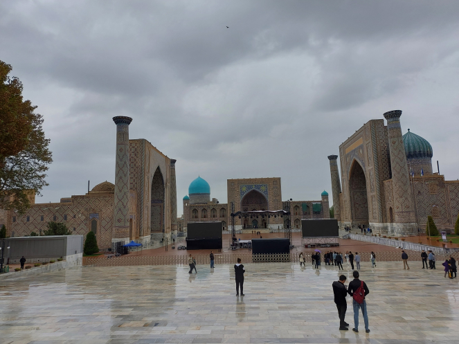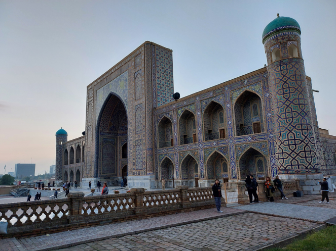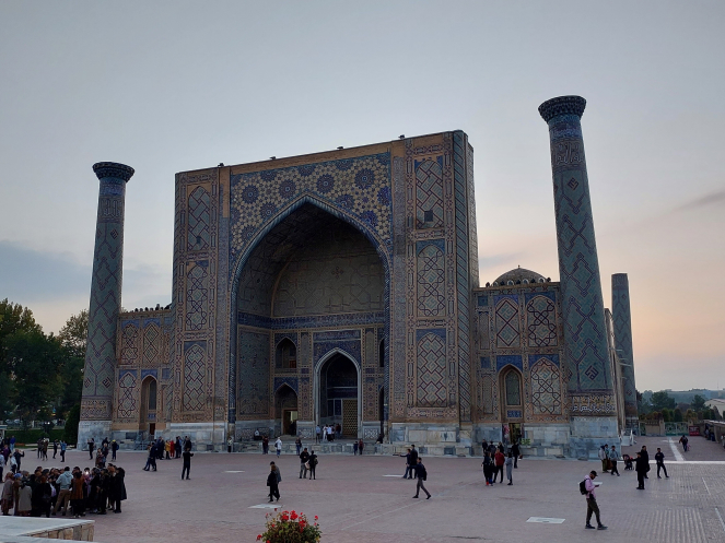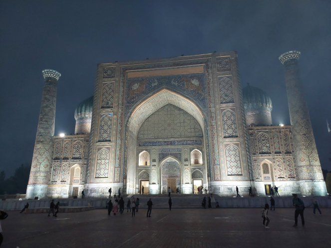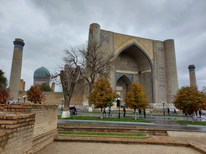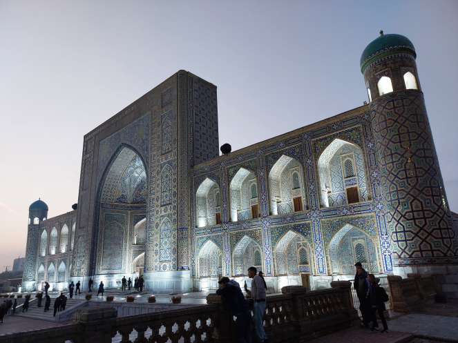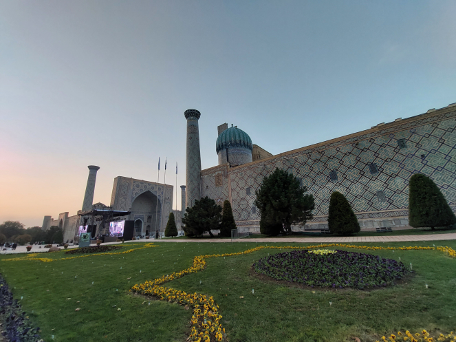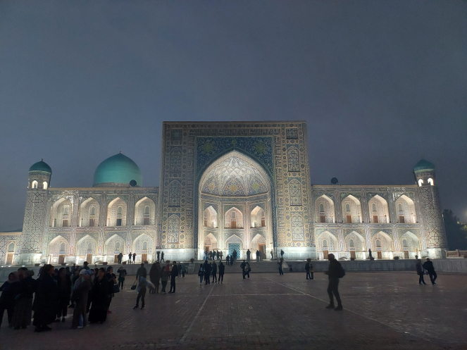 После возвращения в отель получше рассмотрела карту и проложила маршрут от отеля до Гур-Эмира и Регистана: напарник сказал, что при вечерней подсветке они эффектно выглядят. Тут уж я не экспериментировала, шла строго по проложенному маршруту. По пути выяснилось, что не напрасно я накануне сходила к памятнику Тимуру: его закрыли забором и начали чистить. Наверное, перед очередной встречей в верхах, которая должна была состояться в ближайшие дни. Самарканд недавно сильно отремонтировали-отреставрировали, теперь там регулярно устраивают всякие высокие встречи, в этот раз должны были собраться лидеры тюркских стран. Горожанам же это создает лишние проблемы: город перекрывают. Два дня, что мы были в городе, там проходил марафон. Почему его надо устраивать в самом центре – непонятно. Хотя мы удачно избежали больших пробок, гид правильно составила порядок и время начала экскурсий.