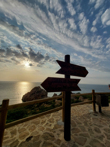 Далее путь лежал на мыс Спартель, на котором установлены топорно исполненные указатели: налево – Атлантический океан, направо – Средиземное море. Говорят, в определенное время года и суток при определенных условиях эту границу видно, но мы разницу не заметили. А место, конечно, живописное, тем более, время шло к закату.
