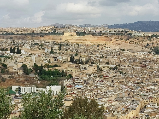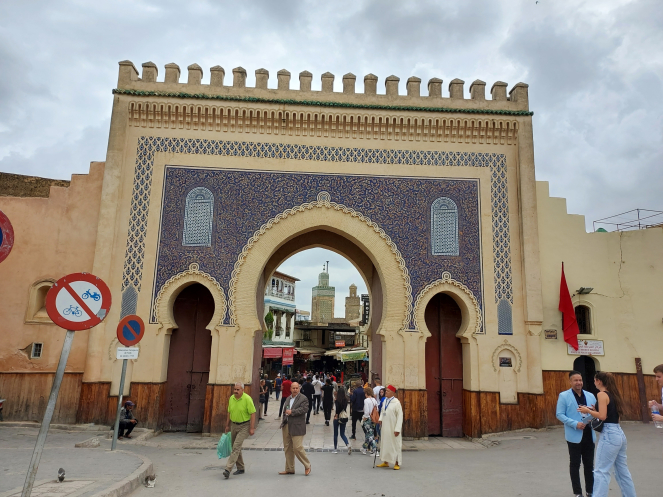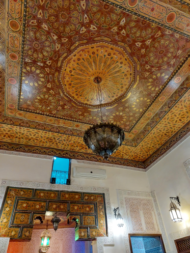 Отель Fes Inn 4* в Фесе, где нам предстояло провести 2 ночи, неплохой, с красивым холлом, но находится вдалеке от цивилизации: Идрис вечером гулять в округе не советовал, тем более, уличного освещения там нет. Нам с подругой «повезло» – номера достались как раз напротив мечети, хотя призыв к ранней молитве в первую ночь меня не особо побеспокоил. При заселении мужчина в национальной одежде угощал желающих приветственным мятным чаем, я попробовала. Холодильники в номерах вроде и работали, но были теплыми внутри. Как потом выяснилось, розетки, в которые они подключены, отключаются при вынимании из специального кармашка карты-ключа. Обычно отключается только освещение, а тут и розетки. Так что за время ужина со шведским столом серое вино остыть не успело. Гид объяснил, что в Марокко производят в основном сухие вина, это не было исключением. Неплохо, но похолоднее было бы лучше. В суете вечера я не сразу поняла, что wi-fi в номере не работает. У подруги ситуация была чуть лучше, ее номер был ближе к роутеру, но тоже для звонка домой пришлось выйти из номера. По закону подлости при этом она захлопнула дверь, а карточка-ключ осталась внутри. Еще одной особенностью отеля было то, что у него номера находятся на разном уровне, а лифт на «полуэтажах» не останавливается. Сходить на ужин не проблема, а с чемоданом подниматься хуже. На следующий вечер, кстати, ужин не был «шведским», а блюда приносили мучительно долго, к тому же не было понятно, сколько будет блюд: может, уже пора уходить, а мы десерта ждем.