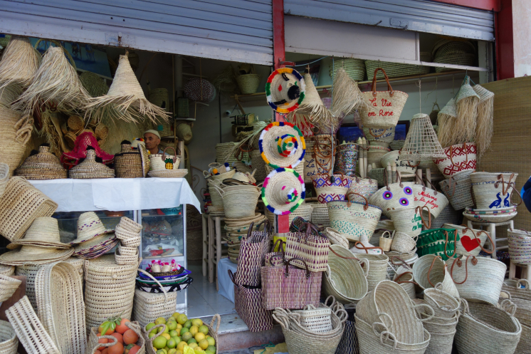Следующей целью была мастерская, где делают шарфики из шерсти и из волокон агавы. Показывался процесс производства, начиная с этих самых волокон, демонстрировались готовые изделия: парень лихо накручивал пестрые тюрбаны женщинам и более скромного оттенка единственному мужчине в нашей группе. Потом делались заманчивые предложения «три по цене двух» и т.д. Подруга вроде дернулась, но, пересчитав на наши деньги, успокоилась. Ну и конечная цель – кожевенная мастерская. Нам повезло, что в тот день в знаменитых чанах для выделки кожи был какой-то не особо вонючий технологический этап, а может, ветерок был не в нашу сторону. На входе всем выдавали по пучку мяты, для отбивания запаха, но она практически не понадобилась. Сначала поднялись наверх, посмотрели на чаны, в которых вымачивают и окрашивают шкуры, посмотрели на развешанные для просушки шкуры и пошли куда? Правильно, в магазин: на верхнем этаже одежда, ниже сумки. Как верно заметила одна туристка: сумок вроде много, а смотреть не на что. Впрочем, один кофр женщина, купившая ковер, приобрела.