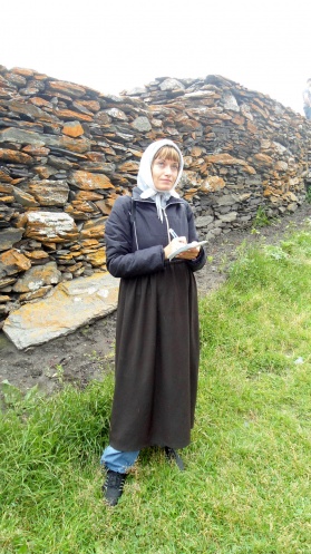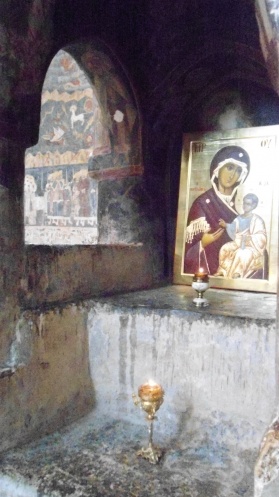 Вниз смотреть страшно. Моросящий дождь усиливает желание завершить прослушивание старинных легенд и войти в церковь. В таких древних церквях с намоленными иконами ощущаешь себя ближе к Богу. Нет пафоса. Никакого золота и ковров. Наш гид объясняет, что при Советской власти все стены церкви были забелены известью, и спустя годы лики святых на иконах проявились. Задерживаемся у каждой, ставим свечи, ведем молчаливый диалог. Сюда приходят люди набожные, разной национальности и путь в несколько тысяч километров - для них не преграда.
