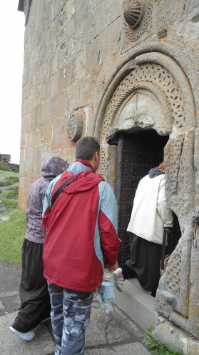 Заказали машины подъема («Нивы» и джипы «Тойота») и всей группой отправились по горному серпантину вверх к церкви. Только рожденный в горном ауле грузин способен при быстрой езде по таким грунтовым узкоколейкам сохранить жизнь себе и своим пассажирам. Нас кидало в разные стороны, было страшно, но мертвой хваткой вцепившись в сиденья, наверх мы добрались в целости и сохранности.