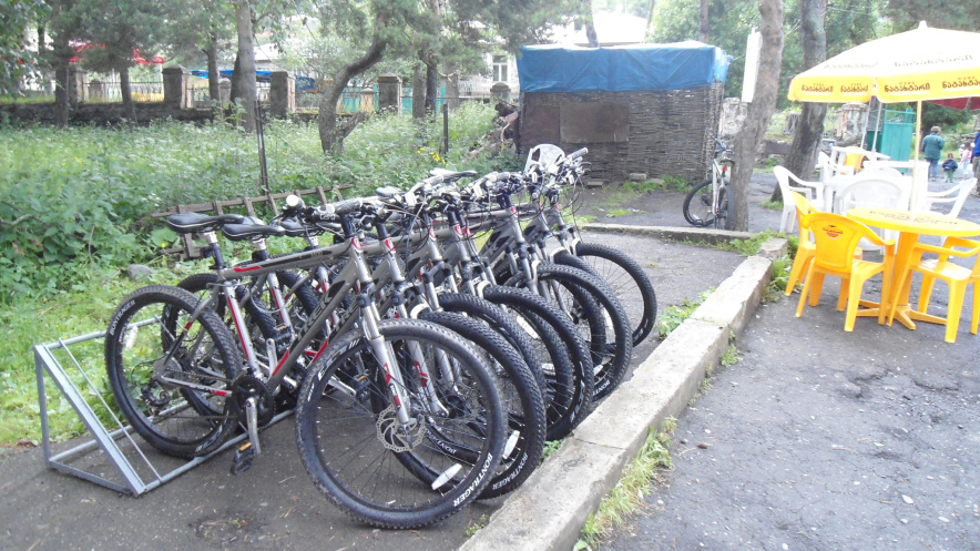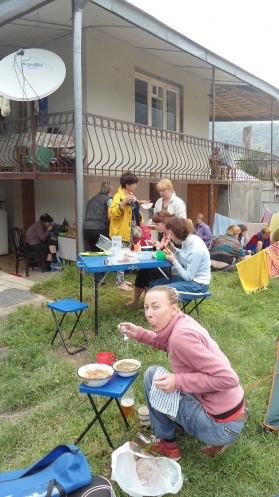 Нам разрешили пройти на территорию комплекса, разбить палатки, воспользоваться туалетом, розетками и прочими благами цивилизации. Местные джигиты тут же доставили к лагерю канистру вина (для продажи), мы расположились компашками на лавочках у входа в здание, сообразили нехитрую снедь на стол (все, что пооставалось у каждого в сумках) и знакомство с Грузией продолжилось)))