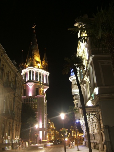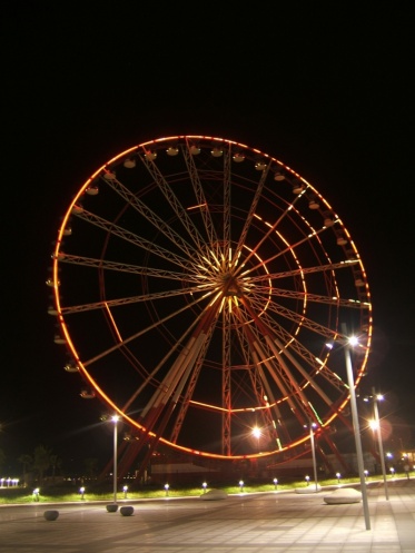 Грузинские женщины, честно говоря, красотой не блещут. Грузные, носатые. Смотрят на наших худеньких девченок и взгляд не отводят. Ушли с пляжа в 18.00. На этаже одна душевая комната, надо всех опередить и наплескаться до ужина)) Все собираются за большим столом на летней веранде. На ужин подают то ли борщ, то ли суп (цветом как борщ, только острый и с лапшой), тушенную с зеленью фасоль, соусы, салаты и вино в кувшинах. Пьем стаканами, как местные)) Нас ждет Батуми. Грузимся в автобус и едем (около часа) на вечернюю прогулку. Автобус остается возле колеса обозрения, на самостоятельную экскурсию выделяют два часа. Понимаем, что осмотр будет беглый, поэтому быстро пересекаем площадь и устремляемся в центр. Кафе в украинском стиле посещаем с целью «М/Ж», оставляя за столиком парня якобы изучать меню.