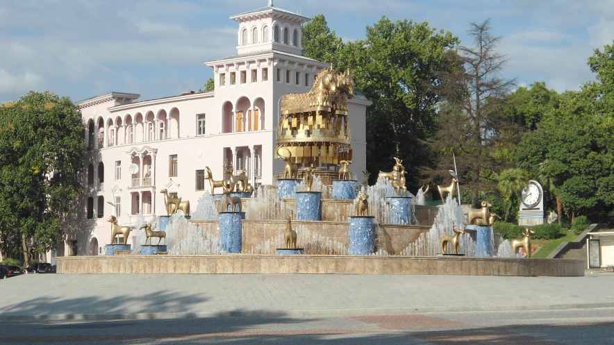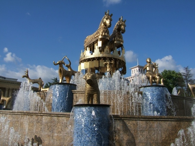 Базар живет своей жизнью: торговцы зазывают, угощают, кто-то поет, а кто-то пляшет. На пробу вина наливают полный одноразовый стакан, так что после третьего бокала просыпается вокал))) и пропадает ориентир - на каком прилавке этот напиток вкуснее. Специи продаются стаканами, покупаем самую популярную – сванскую соль (1 лари), горы разнообразной муки на прилавках напоминают по форме египетские пирамиды. Персики со вкусом яблока можно приобрести за 0,80 лари/кг. Дыни очень сочные, но не сладкие. Покупаем восьмикилограммовый арбуз, успеваем посидеть в кафешке, увидеть центр города и сфотаться у знаменитого языческого фонтана.