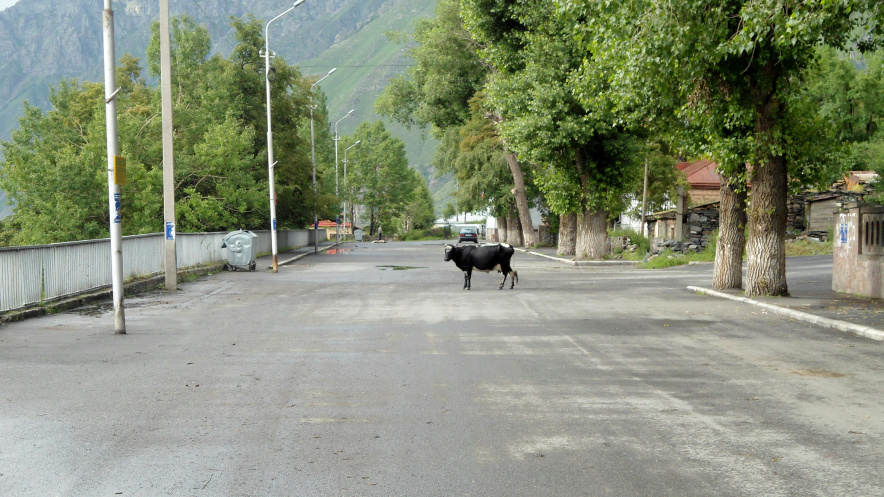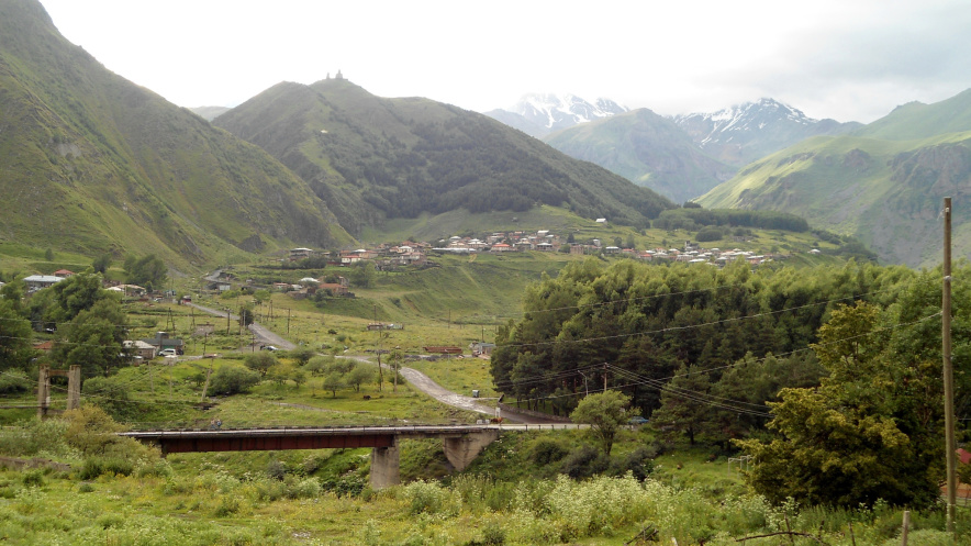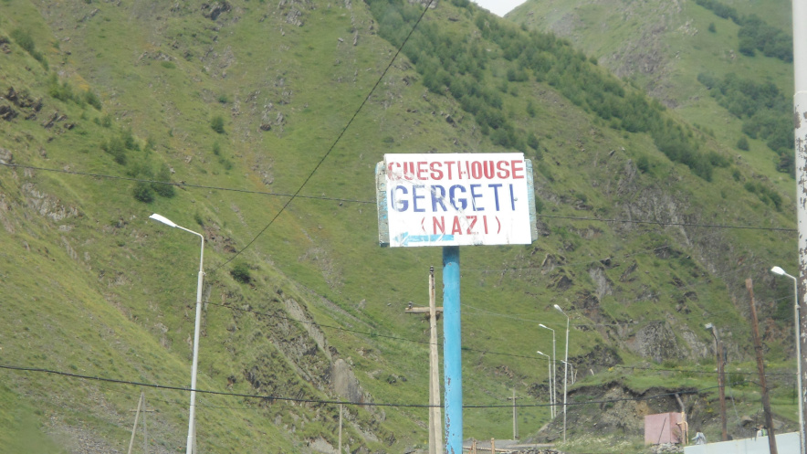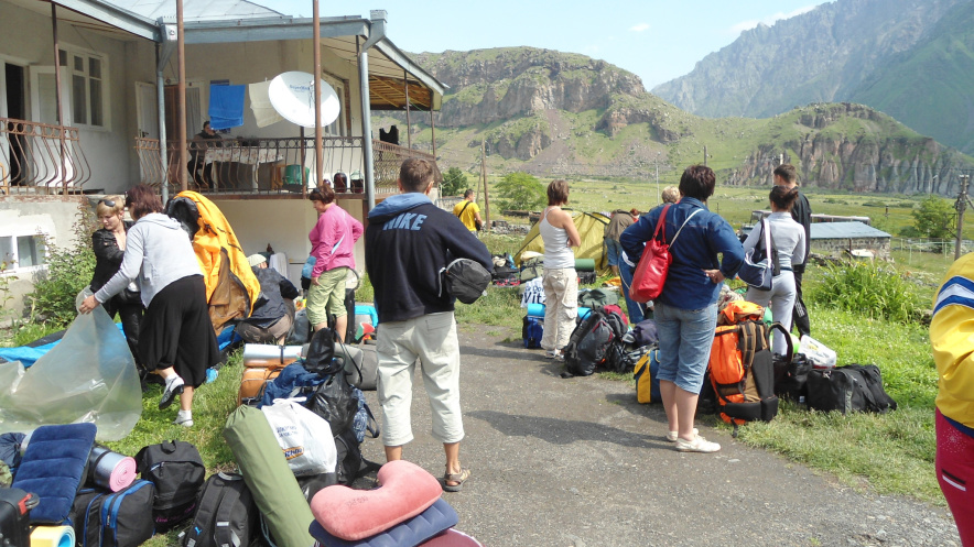 Казбеги. Первая остановка в Грузии – поселок Гергети, 24 км от границы. Милая русскоговорящая девушка – работник таможенной службы -подсказала, где можно остановиться нашей группе. Сделала звонок, сказала, что нас уже ждут. Дорога в Грузии разочаровывает с первых же километров пути. Ее просто нет! Неровная грунтовка с неосвещенными тоннелями. Жесть! Мы увлеклись горными пейзажами и пропустили ожидающих нас местных парней на джипе. Они догнали автобус, просигналили, наш руководитель вышел, переговорил с ними, и мы отправились к месту будущей стоянки. Две ночи в автобусе, восьмичасовая прогулка по Кисловодску (по международным правилам автобусу требовался отстой, а водителям отдых) усиливали желание как можно скорее припасть к грузинской земле))) Несмотря на моросящий утренний дождик, возле гэст-хауза Генри мы разбили палаточный лагерь, приготовили общими усилиями французский супчик (по секретному рецепту Макса), с удовольствием позавтракали.