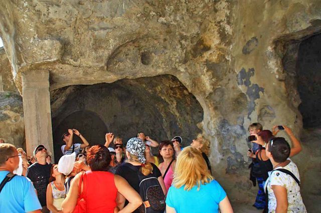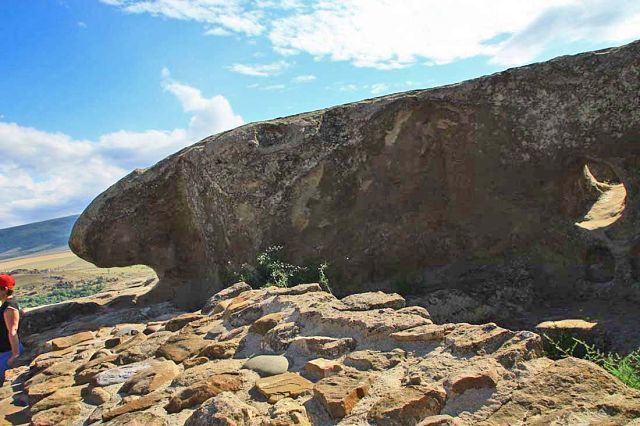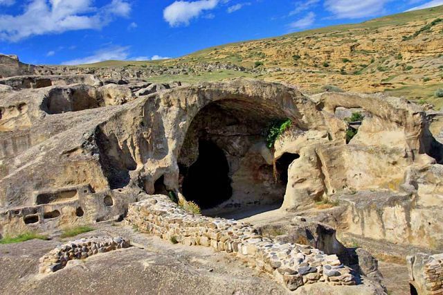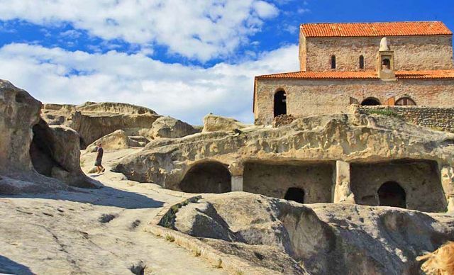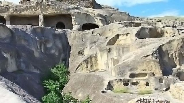 Следующая остановка древний горный город – Уплисцихе- построенный в 10 в. до н.э. Экскурсовод – истинный грузин старшего возраста – делится секретами молодости: «Выпиваешь кружку вина в обед, и кружку вина вечером, вах-вах - сердце не болит». И куча историй как доказательство. Еле поспеваем за старичком карабкаться вверх! Он успевает по пути что-то рассказывать и показать как перебраться через горы и сбежать в Китай))) Пугает местными ядовитыми змеями, перечисляет экскурсии, которые водит за сутки по этим тропам (есть и украинцы, но мы численным количеством превосходим любую их них), рекламирует вино собственного производства (2 тонны вина каждый уважающий себя грузин делает для себя, остальное сдает на завод. Виноград вызревает на солнце без полива, ведь в году 340 солнечных дней), и толкает авторские экскурсионные брошюры «по приемлемым ценам».