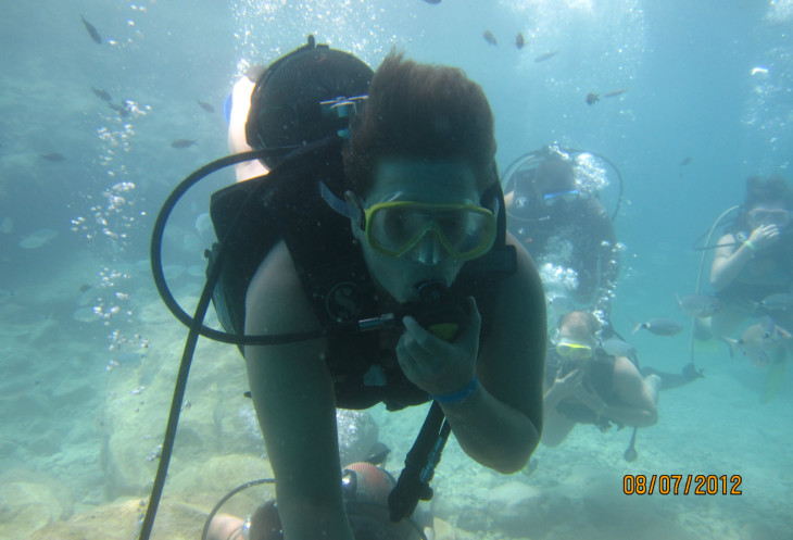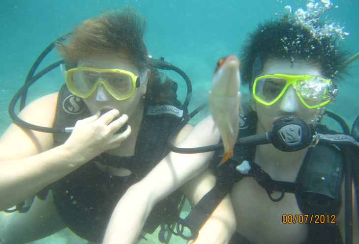 Первая мысль, посетившая меня, после того как нас нацепили 20-ти килограмовые акваланги, жилеты, маски и скинули в воду, была: "Как дышать?" Ощущение, что воздуха не хватает, вызвала поначалу панический ужас и желание бросить эту затею. Тем более, что многие до меня уже сошли с дистанции на этом этапе. Но какой-то червячок самолюбия или гордости, ковыряясь в моем мозгу, надавил на какие-то одному ему известные болевые точки, внушив мне, что я смогу, я ДОЛЖНА это сделать. Осознав таки не на словах, а на деле, что в процессе дыхания участвует только рот, я перестроилась и показала инструктору свою готовность. Он мне жестом дал понять, что можно погружаться. Что я и попыталась сделать. Но не тут-то было. Перед тем, как столкнуть меня в море, мне зачем-то так сильно надули жилет, что сейчас я как мячик болталась не поверхности, не в состоянии уйти под воду. По-видимому, добрые инструкторы перестраховались, решив, что я не в состоянии буду всплыть самостоятельно. Обидно, да! Видя мои безрезультатные потуги, инструктор начал меня притапливать.