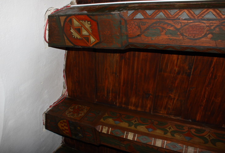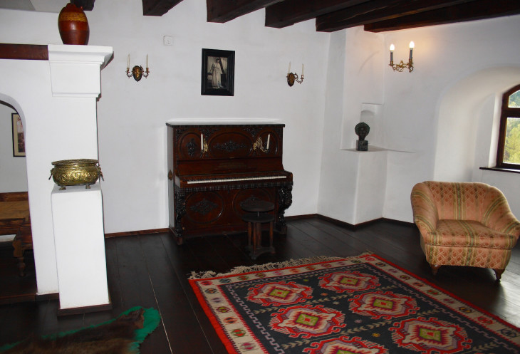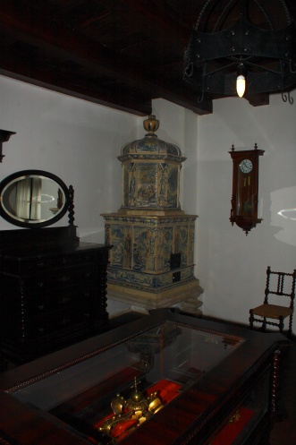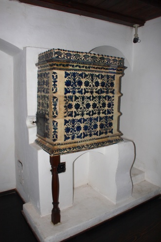 камины облицованы традиционным для Румынии видом керамики. А также, стоит обратить внимание на потолочные балки, Кроме того, что они весьма искусно украшены росписями, на них изображены гербы почетных гостей замка