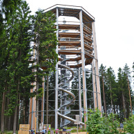 Тропа состоит из двух конструкционных элементов: собственно тропы, проложенной на высоте 24 метра над землей, и смотровой башни высотой 40 метров. Длина плоской тропы – 372 метра, длина винтового подъема на вершину башни – 303 метра. Сама башня – уникальная деревянная постройка, опирающаяся на девять пилонов. Она выглядит почти воздушной и прекрасно вписывается в окружающий природный пейзаж. С ее верхней площадки открывается захватывающая дух панорама Национального парка Шумава, Новоградских гор и озера Липно. Тем, кому повезет подняться сюда в ясную погоду, будут доступны для обозрения даже Альпы со стороны соседней Австрии.