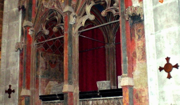Сверху над нишами расположены гербы или щиты, что также является типичным элементом для гробниц того периода.