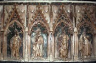На изображении видны четыре ниши с фигурами святых или других важных религиозных деятелей, выполненные в характерном для готики стиле.