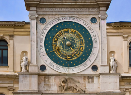 Астрономические часы, украшающие башню являются старейшими в мире,среди аналогичных.Первые часы были изготовлены Якопо Донди в 1344 г.Они стали столь известны в свое время, что потомки Донди стали носить прибавку к фамилии - Часовые(Dondi dell'Orologlio). Во время войн между кланом Каррара и венецианцами часы сильно пострадали от пожаров. Точную копию часов Донди спроектировал в 1436 г. Маттео Новелло, а реализовали в 1437 г. Джованни и Джовампьетро Калдиере.Механизм часов уникален:кроме времени они показывают день недели и месяца, лунную фазу и текущий знак гороскопа. Кроме того, вместо арабских цифр на циферблате были 24 римских. Интересно то, что согласно легенде,мастер установил вместо зодиакального знака "Весов" клешни "Скорпиона", чтобы отомстить заказчику за нерегулярную оплату.Сейчас драгоценный механизм находится на 3 этаже башни в огромном шкафу, закрытом замок.В 2010 г. башня вновь открылась после 20-летней реставрации. На восстановление часов было потрачено 300000 евро.