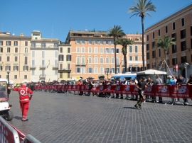 Каждую весну РИМ принимает в свои обьятия самых лучших бегунов мира. Мы совершенно случайно попали на такое событие-10 апреля проходил марафон и получили массу приятных впечатлений, которые останутся в наших сердцах. Так как нашу прогулку сбило ,что на остановке автобусов мы не дождемся /мы подумали о забастовке/ мы нырнули в метро и удачно вынырнули на площадь Испании-и такой сюрприз!!! Болели за каждого участника, все хлопают и радуются, красота!!! Маршрут марафона не меняется с момента первого забега /с 1994 г/ ,он проходит через Собор Святого Петра, Колизей и другие прекрасные местечки ,а старт и финиш находится около Римского Форума. Движение транспорта было приостановлено и поэтому весь центр был для прогулки удивительно хорош. ДЛЯ ПОБЕДИТЕЛЕЙ МАРАФОНА МОЛОДОЙ ,ТАЛАНТЛИВЫЙ СКУЛЬПТОР Marco Pittaci придумал дизайн медалей с изображением бегущих вместе мужчины и женщины. Первое место занял кениец Амос Кипруто, а среди женщин бегунья из Эфиопии Рама Туса.