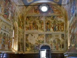 Стена, противоположная алтарной. На ней располагаются фрески на тему детства Иисуса. Вверху: Благовещение, в середине слева: Благая весть пастухам, справа: Поклонение волхвов, слева внизу: Бегство в Египет, справа: Принесение во храм.