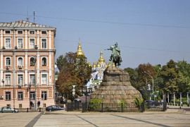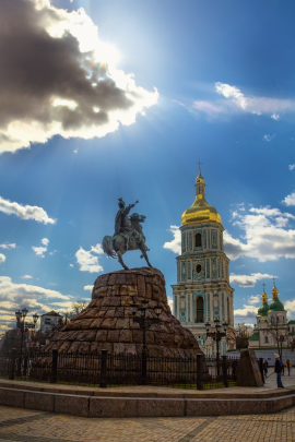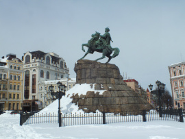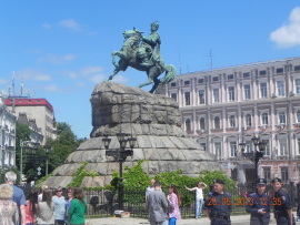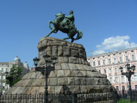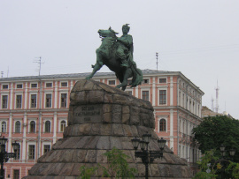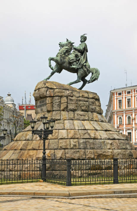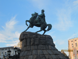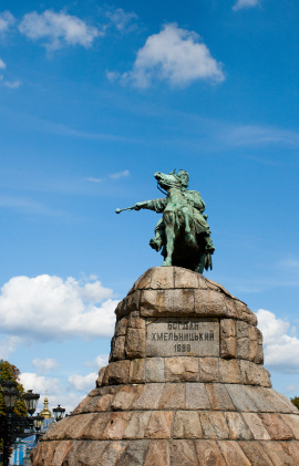 Один из немногих уцелевших дореволюционных памятников Киева. Фигура гетмана на коне установлена в центре Софийской площади, где зимой 1649 года, проходили чествования Хмельницкого и его войска, как героев освободительной войны против Польши. Считается, что именно в Киеве, восстание превратилось в осознанную войну за отделение Украины от Польши. Воспользовавшись помощью Российской империи, Богдан, в конце-концов привел Украину под власть этого государства. Считается, что именно поэтому, гетман – памятник указывает булавой в сторону Москвы