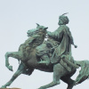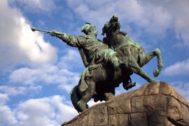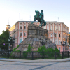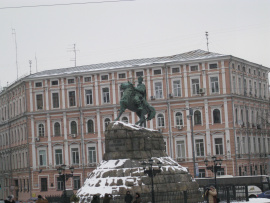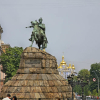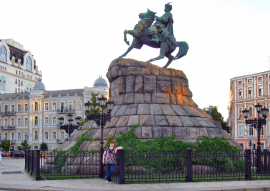 Памятник сей, простоял 10 лет в Петербурге, на "заднем дворе"... Ибо не было денег у магистратуры заплатить за работу... Планировалось, что постамент будут окружать скульптуры: стилизованые жители Украины. Денег не хватило и на это... Имеем то, что имеем! Затем возник вопрос о том, куда хвост коня и куда булава... Везде храмы... Легенда гласит, что булава на Московию указывает!