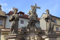 Скульптурная группа Святых Козьмы и Домиана была изготовлена в 1709 году Ян Олдржих Майер на средства медицинского факультета Карлового университета. На трехэлементном постаменте стоят три фигуры святых. В центре фигура Спасителя «главного врачевателя мира». За фигурой Спасителя возвышается крест с надписью на латыни: «В этом кресте – наше спасение». По правую руку от него стоит святой Козьма, надпись на постаменте «Гиппократ между святыми». По левую – святой Дамиан, надпись на постаменте: «Богомольному брату, Галену небес». Козьма и Дамиан, два брата, которые лечили бедняков и нищих бесплатно. Оба брата, которые во времена гонения христиан, были схвачены, подвергнуты мучениям и обезглавлены, считаются покровителями врачей